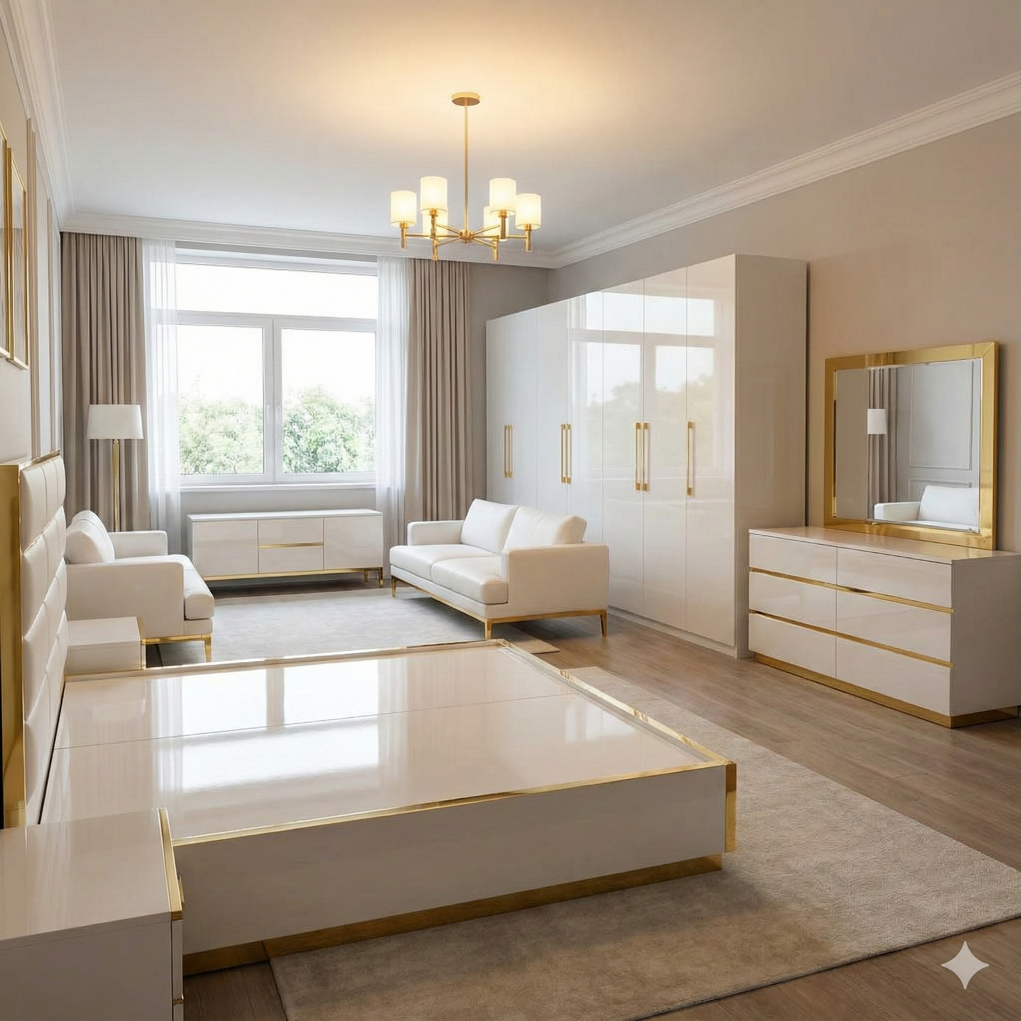 Brighten your space with the Radiant Luxe Suite—a high-gloss white and brushed-gold bedroom collection that blends modern elegance with timeless luxury. Featuring a grand upholstered bed, expansive wardrobe, vanity dresser, and coordinated lounge pieces, this set creates a luminous and opulent retreat.
